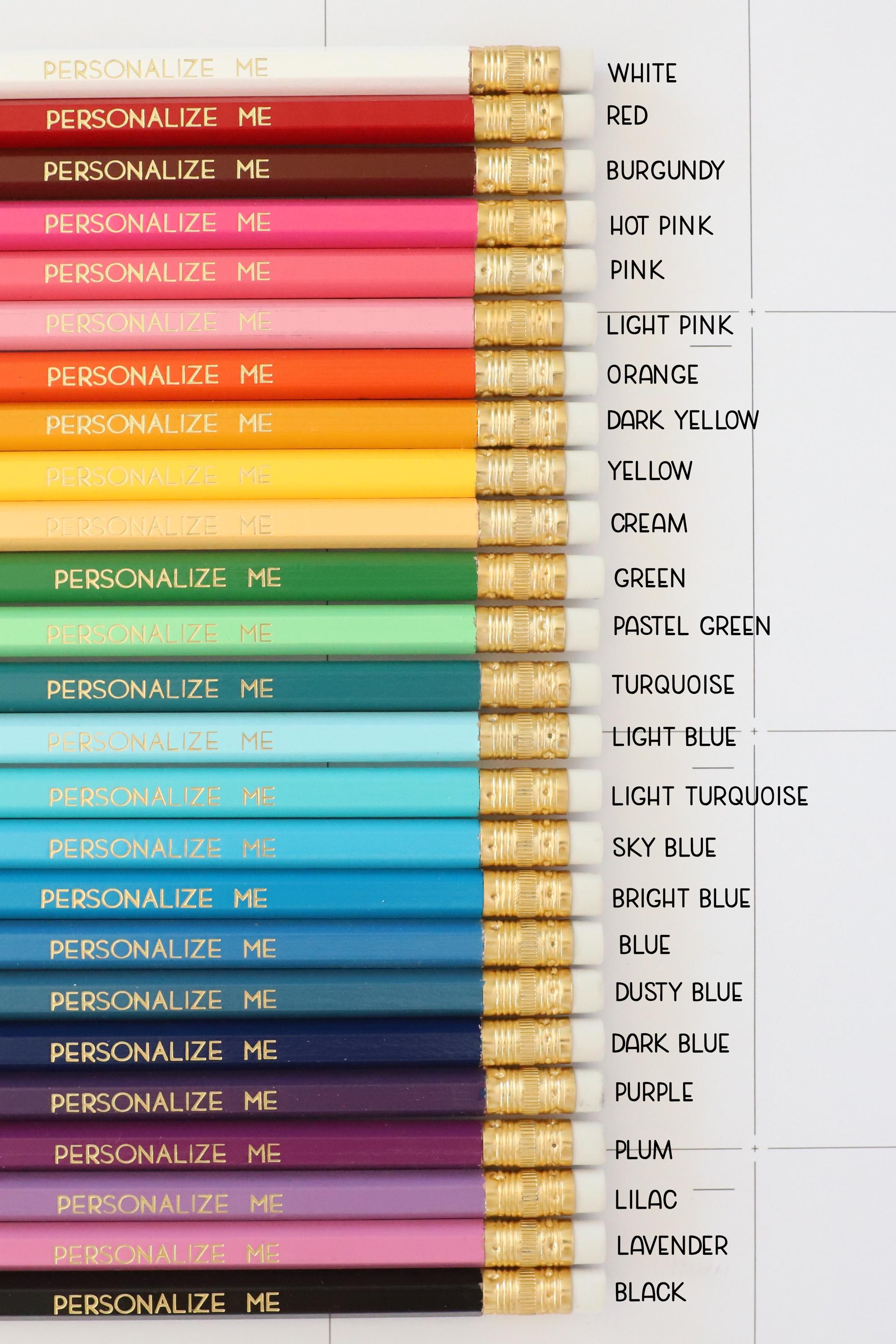 Choose your pencil color from the first dropdown menu. When selecting "Select your own color combo" as the color option, please indicate your color choices along with your customization in the personalization box.